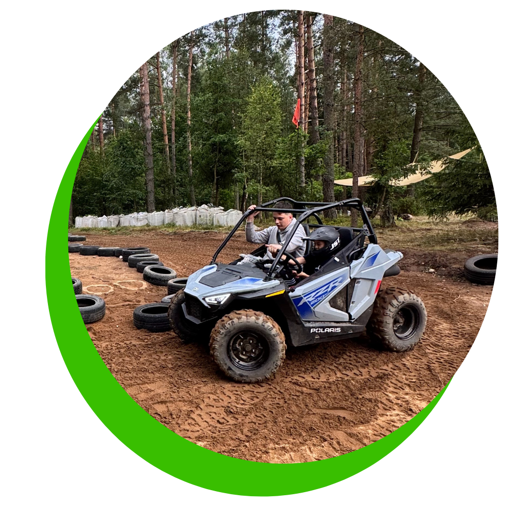Rozbudowany tor gokartowy oraz dwa typy buggy, dopasowane do wieku i możliwości uczestników. Jazda odbywa się w kontrolowanych warunkach, z naciskiem na bezpieczeństwo i sportowe emocje.